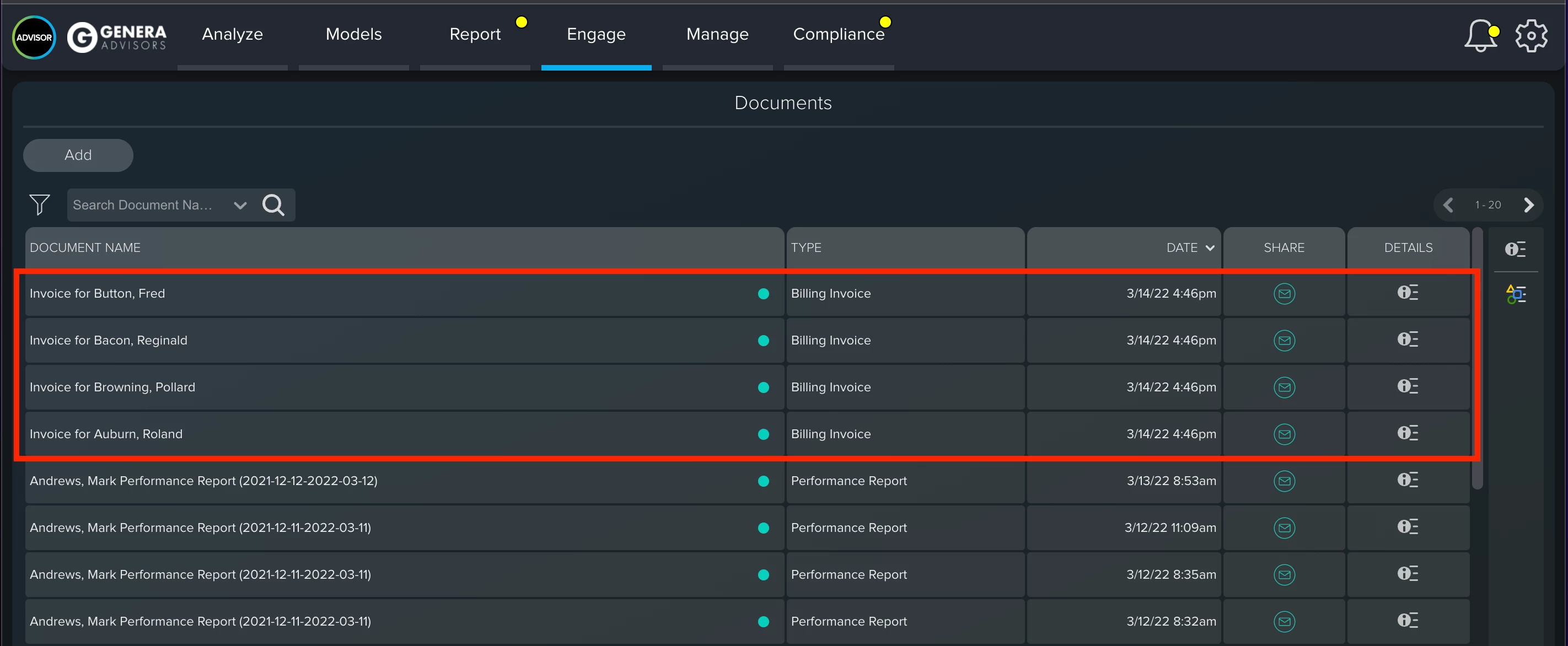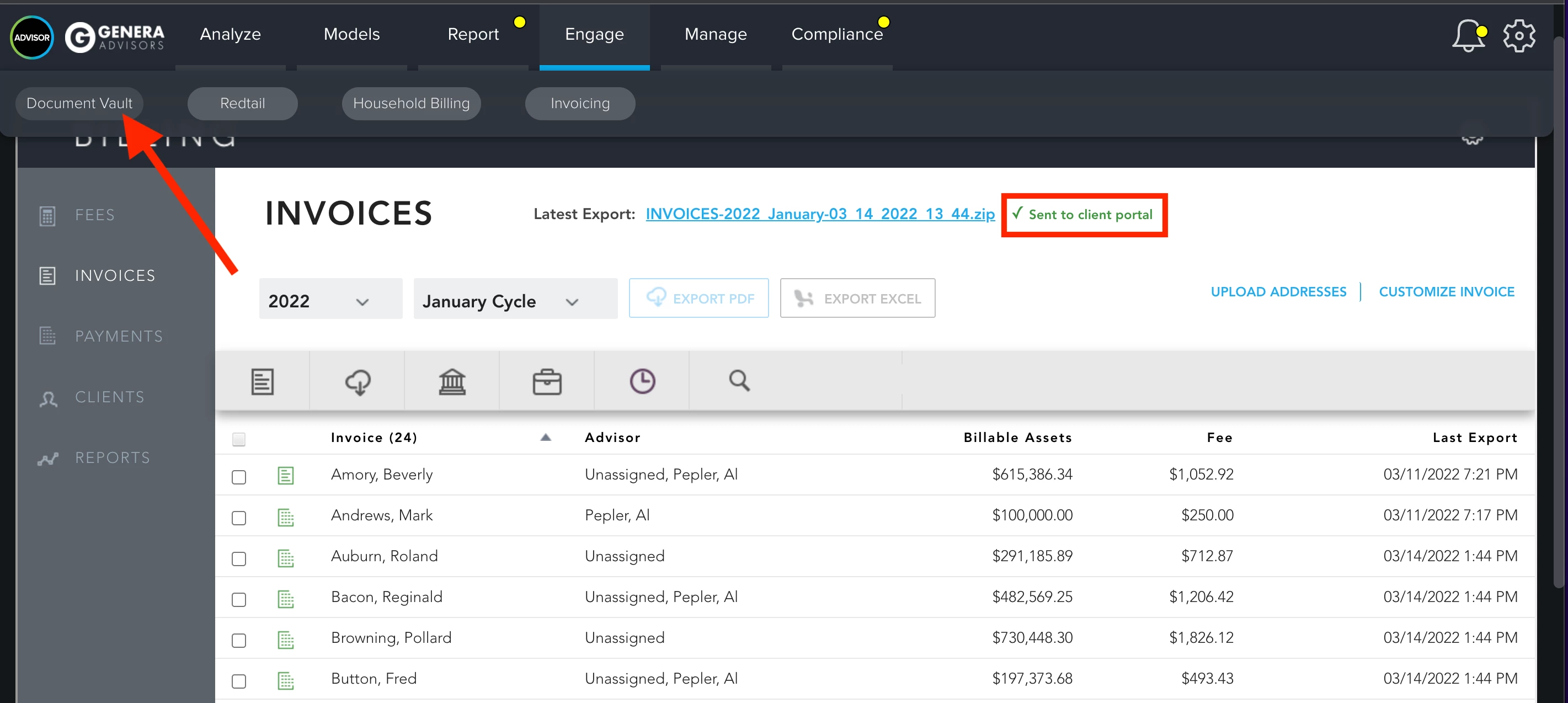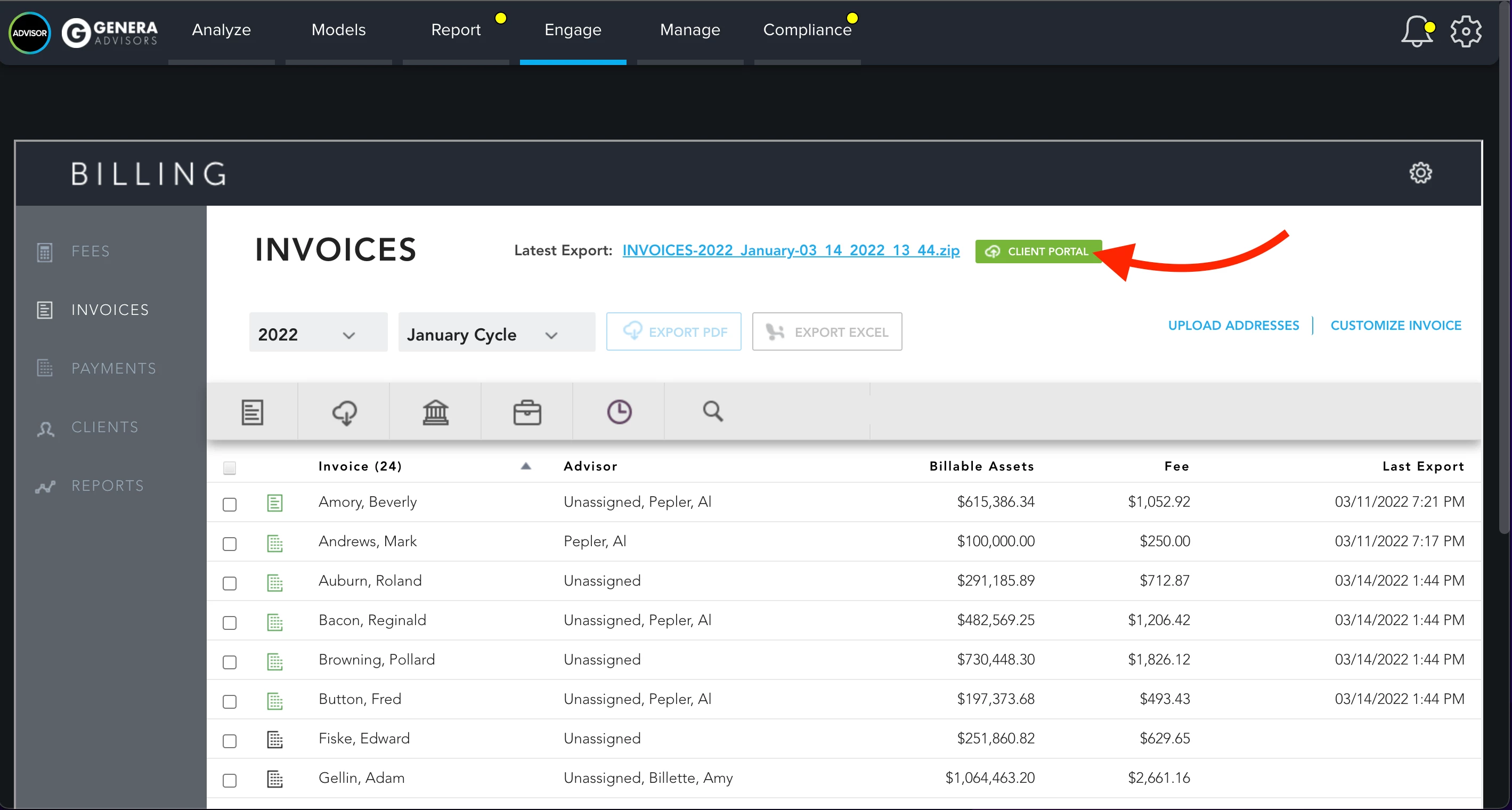 After the Invoices are generated, click the green Client Portal button to instantly export the invoices to your CircleBlack Advisor document vault: