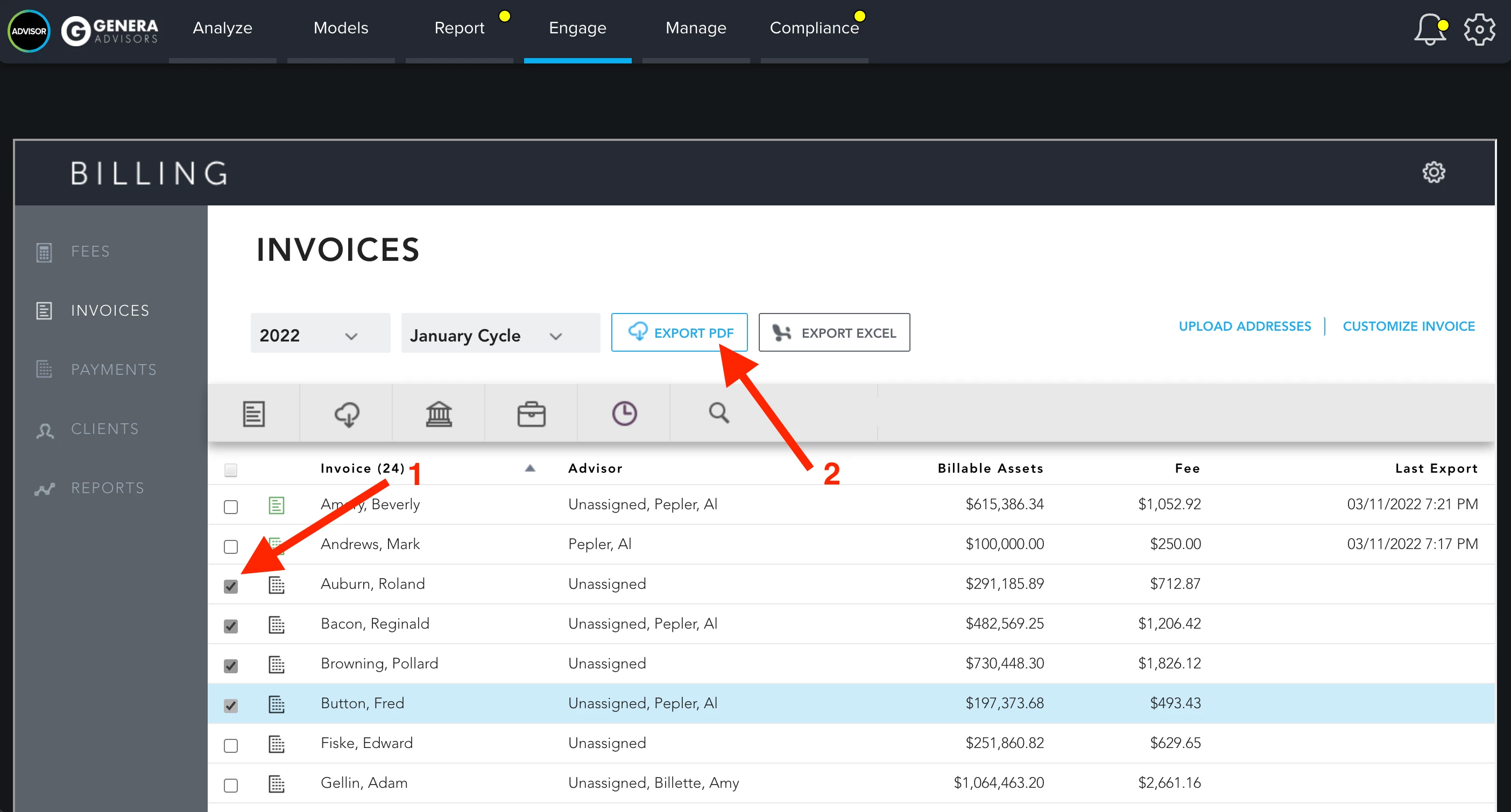 In BillFin, once the fees have been generated for your clients, navigate to the “Invoices” page. On the Invoices page, (1) select one, multiple, or all clients to generate an invoice and then (2) click the “Export PDF” button: