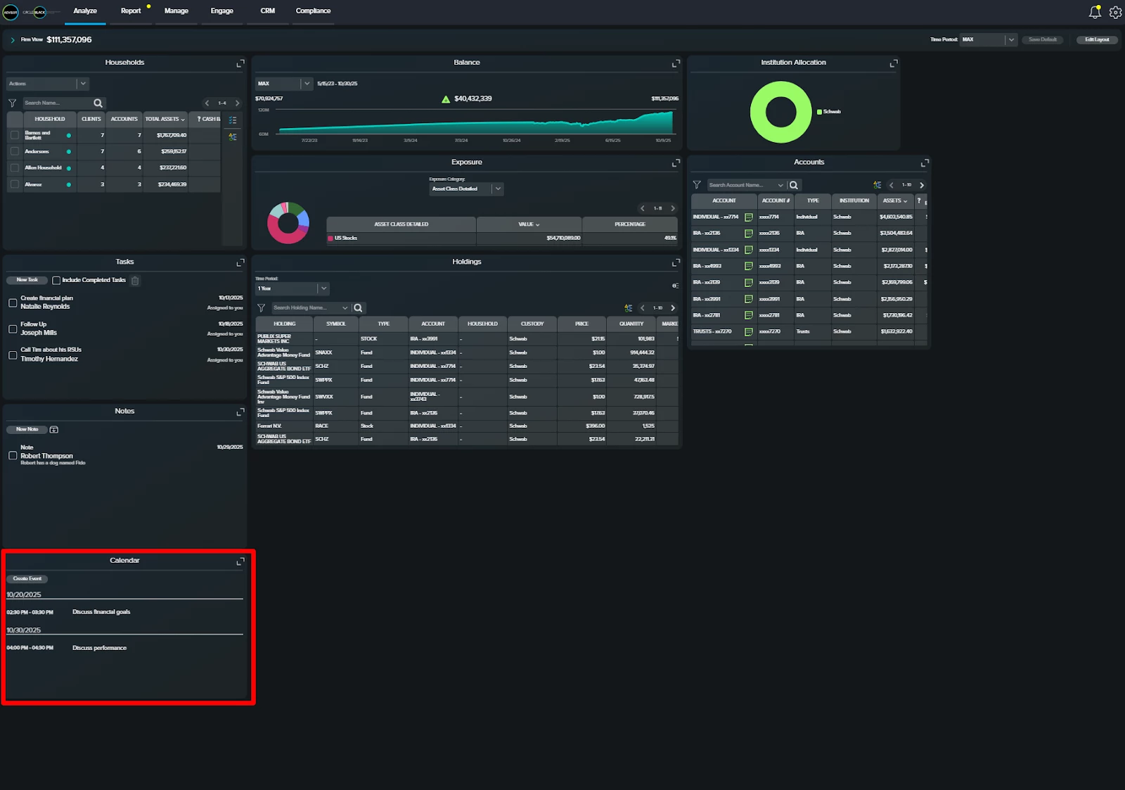 Yes. The Calendar is embedded in your Advisor Dashboard, allowing you to view meetings alongside CRM activity and portfolio performance data.