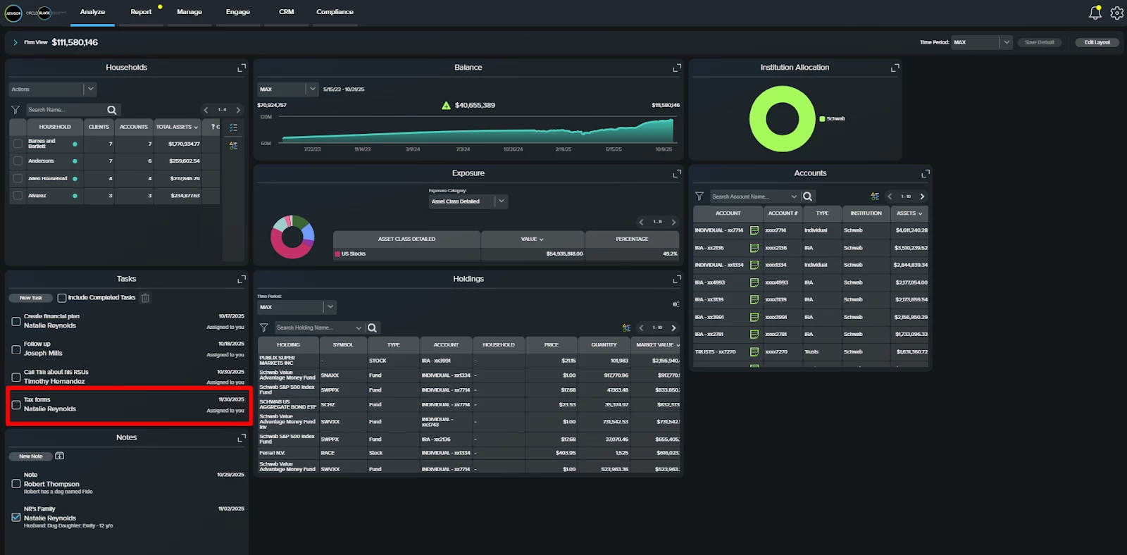 CircleBlack Tasks helps advisors stay organized by tracking everything from client follow-ups to compliance requirements. Tasks can be created manually or automatically through workflows, and overdue items are clearly flagged for attention.