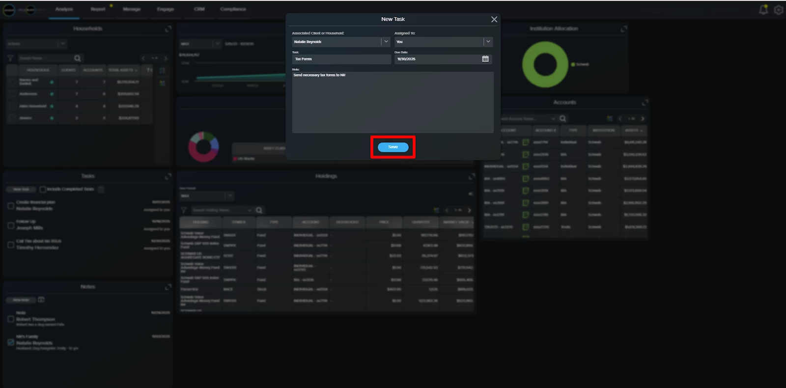 On the “New Task” screen, enter the subject, description, associated client or household, due date, and assignee.