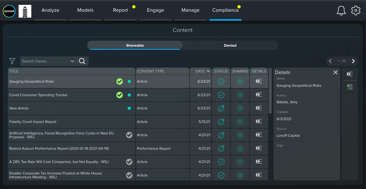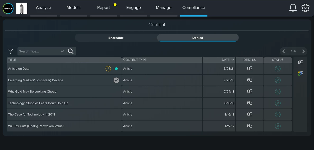 The Compliance Content section allows compliance users to review articles and documents that have been approved or denied for sharing with clients. This section serves as the compliance user's content library. This user guide will review each tab within the Content section: Shareable and Denied.
