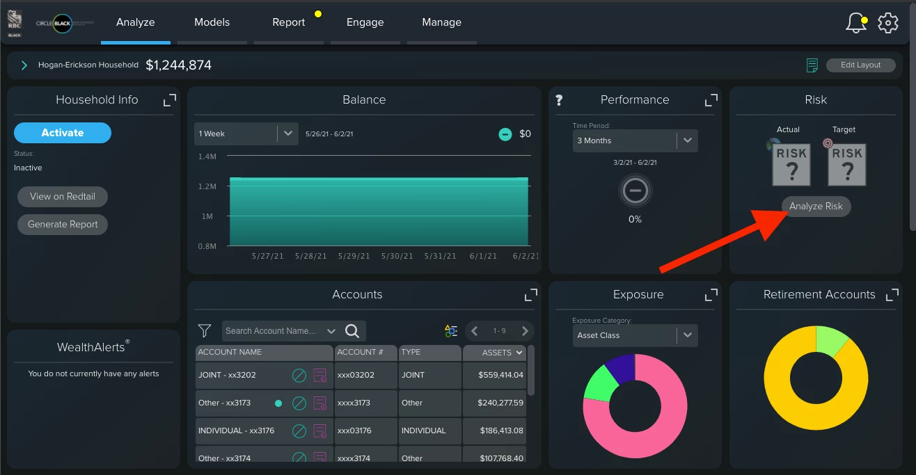 To link a Household in CircleBlack to Nitrogen, navigate to the desired Household’s Dashboard and click the Analyze Risk button the Risk tile.